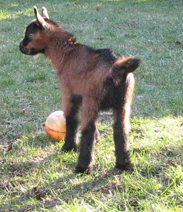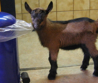 Nun sollte unerwartet wieder eine Ziege unseren Weg kreuzen. An einem kalten Donnerstagnachmittag im Februar 2004 wurde mir ein drei Tage altes Ziegenlamm zur Behandlung vorgestellt. Unfähig auf den Hinterbeinen zu stehen, konnte es nicht an der mütterlichen Zitze saugen. Nach Ergänzung des fehlenden Spurenelements Selen, erwachte mein großes Ziegenherz. Ich entschloß mich vorübergehend die Mutterrolle- mit der Flasche in der Hand- zu übernehmen.